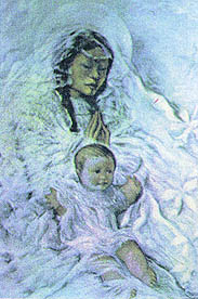 "A Madona Alba Plena", com flor de difícil reconhecimento, simbolizando a total pureza de Maria e onde se destaca a alegria do Menino Jesus contemplando as flores. |