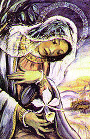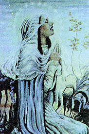 "VIrgem da Chuva de Ouro", que apresenta a Virgem numa visão matutina, a orquídea é um Oncidium varicosum, desabrochando na ante-manhã do dia, onde Maria é a nuvem protetora do Justo, a Aurora do Messias prometido e enleva-se a considerar sua altíssima missão. |
