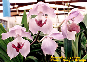 Acacallis cyanea, you cultivate it here, in Rio de Janeiro, in warmer conditions. And Acineta and Aerangis where do you cultivate them? WS: I cultivate them in Petropolis (mountain region). |