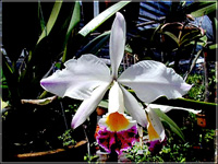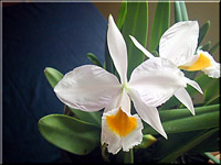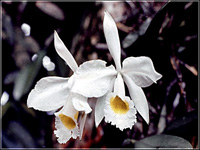 Vigorous height plants and flowers with 14 cm across or more; White petals and sepals; Almost entirely white lip, with a orange-yellow suffused fauce. | |
