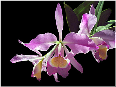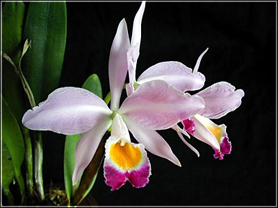 Pale rose sepals and petals; Pale rose lip with yellow-orange suffused fauce. | |