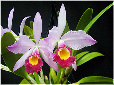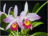 Bright rose sepals and petals; Petals and sometimes sepals with purple to red-purplish blotched edges; Dark roseish lip, with orange-yellow suffesed fauce; Red-purplish suffused apical lobe and edges of the lateral lobes. | |
