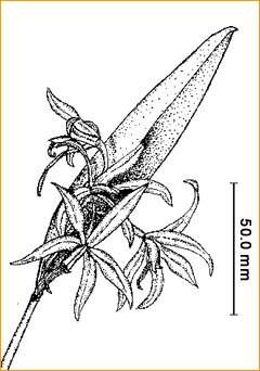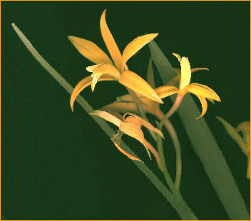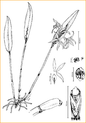| Descrição: Planta epífita, subcespitosa, com pseudobulbos cilíndricos, atingindo até 15,0 cm de comprimento por 0,4 cm de diâmetro, unifoliados; folhas lanceoladas, avermelhadas no dorso, coriáceas, com até 13,0 cm de comprimento por 1,8 cm de largura na sua parte central; inflorescência apical, curta, ostentando normalmente 4 a 6 flores simultâneas; flores pequenas, amareladas ou alaranjadas; sépalas levemente reflexas, a dorsal lanceolada, com 3,2 cm de comprimento por 0,6 cm de largura e as laterais falcadas, com 2,8 cm de comprimento por 0,7 cm de largura; pétalas lanceoladas, também levemente reflexas, com 3,2 cm de comprimento por 0,7 cm de largura; labelo profundamente trilobado, com 2 carenas baixas no centro, com 2,5cm de comprimento por 1,0 cm de largura, o lobo mediano agudo, com as margens onduladas; coluna da mesma cor dos outros segmentos, com 1,0 cm de comprimento por 0,3 cm de largura; 8 polínias |