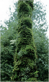 | Neste tipo de ecossistema, são muitos comuns os cursos de água, assim além da umidade da névoa que toda noite vem do mar, ainda se tem a umidade provocada por estes cursos. "... este sistema é muito úmido daí a grande dificuldades em cultivar as orquídeas dele originárias, especialmente os Oncidiuns porque elas são habituadas à névoa da noite, que não só ajuda a baixar a temperatura, que é uma coisa de que precisam muito, como provê também a umidade necessária ao seu desenvolvimento. O maior inimigo da orquídea é o excesso de água, embora essas orquídeas da Mata Atlâtinca estejam num ambiente muito úmido, elas estão na casca da árvore que seca muito depressa. A chuva escorre, vem o sol e seca aquilo tudo. Mas se você deixar a planta num lugar muito protegido em vaso ou debaixo de uma folhagem muito densa, não vai secar. Então a raiz apodrece e mata a planta." (Palestra de Carlos Eduardo de Britto Pereira, sobre habitats de orquídeas no Brasil, Jardim Botânico, setembro 2002). | ![]() Tronco com musgo e Phymatidium em ambiente de muita umidade (foto:FM) |
