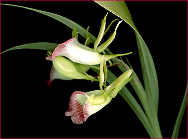 | . | Descrição: Planta epífita, cespitosa com pseudobulbos fusiformes, atingindo até 13,0 cm de comprimento por 1,5 cm de diâmetro na sua parte mais larga; inicialmente foliados e depois cobertos por restos de bainhas foliáceas. Folhas linear-lanceoladas, verde acinzentadas, dísticas, um pouco plicadas, articuladas, decíduas, de tamanho variável, as maiores com até 20,0 cm de comprimento por 1,5 cm de largura na sua parte central. Inflorescência apical, com racemo arqueado, ostentando normalmente 5 a 6 flores simultâneas. Sépalas de cor ocre esverdeada, com 2,7 cm de comprimento por 0,4 cm de largura, sendo a dorsal lanceolada e as laterais levemente falcadas. Pétalas falcadas, da mesma cor das sépalas, com 2,5 cm de comprimento por 0,6 cm de largura. Labelo infundibuliforme, obscuramente trilobado, com 4 quilhas internas no seu centro, sendo as duas externas bem mais altas que as centrais; dotado de calcar estreito; quando explanado medindo 6,00 cm de comprimento por 3,5 cm de largura; tubo esbranquiçado, ápice purpúreo e calcar amarelado. A coluna é esbranquiçada e tem 10,0 mm de comprimento por 3,0 mm de largura. |