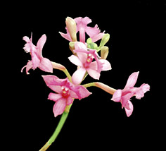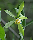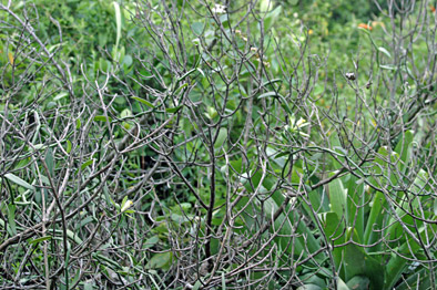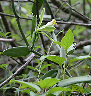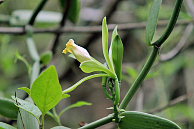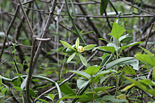 | Crescendo também diretamente na rocha, misturada ao Epidrendrum denticulatum ou ainda protegida pelos pés de clusia, surgem também a Vanilla com suas flores verde-esbranquiçadas. |