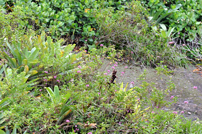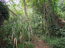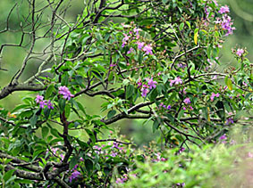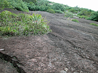 .Na encarpa, nos primeiros 600 metros, no verão, crescendo diretamente da pedra nua ou entre as fendas ou ainda entremeadas a outras plantas rupículas, surgem os exemplares de Vanilla sp e de Epidendrum denticulatum, aos montes com suas flores róseas ou quase púrpuras dependendo da ensolação ou do tempo de abertura, pois elas tendem a escurer à medida que envelhecem. A partir segunda metade do caminho, o bosque é contínuo e e as rupícolas não aparecem, pois a área é bem sombreada. A atração passa a ser, no lugar do reino vegetal, o reino animal com seus pássaros, micos, lagartos e até uma enorme e tímida iguana que não se deixou fotografar. Eles fazem a alegria da criançada e até mesmo dos adultos. |