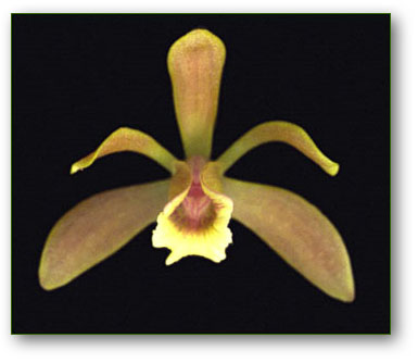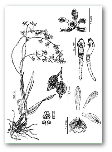 | Discussion: There are no similar flowers in Brazil. The peculiarity is to have the lateral lobs of the lip very wide and long in proportion to the medium one and do not present an isthmus of liaison with it, forming a continuos surface when flatted. The lip also forms, due to its proportions, a kind of tube around the column which does not occur with other species. The pedicel which sustains the flowers is intensely verrucose, as well the capsules of seeds. |