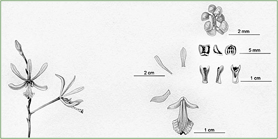 de 25 flores versus 120), e por seu labelo caracterizado pela cor