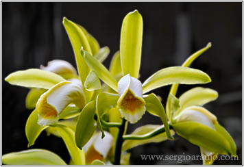 São Paulo. Vegeta, em geral, ao nível do mar, nas regiões litorâneas, sobretudo nas restingas ou mangezais, mas se estende até altitudes mais elevadas. Seu porte pode chegar a 25cm e seus pseudobulbos, tipo cana, são particularmente finos. Quando forma grandes touceiras, faz sobressair a beleza delicada de suas flores, com até 12cm de diâmetro. Suas flores, de perfume suave de maçã verde, às vezes imperceptivel, nascem em número de 2 a 5 por haste floral, que emerge de espata ainda verde. Floresce desde a primavera até o verão. Seu colorido varia do verde-maçã até o castanho claro. Seu labelo é esbranquiçado estriado de vermelho e quilhas salientes na parte discal. |