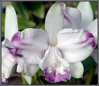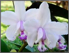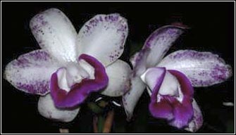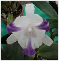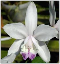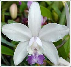 - white petals and sepals. Lip with light or dark purple frontal lobe.