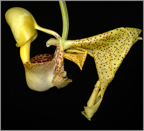 por um diâmetro de 5 mm, direto, um pouco arqueado no ápice, amarelo vivo, imaculado; epiquilo cupuliforme, 2 cm de profundidade, abertura oval com 2,5 × 2 cm, longamente tridentado no ápice, exterior branco amarelado com raras e pequenas pintas púrpuras na base. Interior bastante pintalgado de púrpura; coluna claviforme, com aproximadamente 2,5 cm de comprimento, base ornadas com 2 chifres, ápice recurvado.