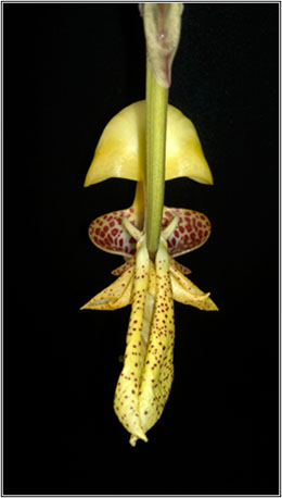 Seção Coryanthes. Planta epífita, cespitosa, pseudobulbos ovoides atenuadas na parte superior, 7-12 × 1,8-2,6 cm, um pouco arqueados, profundamente pluri-sulcados, ornados na base por 1-2 bainhas apergaminhadas longas, agudas, bifoliadas no ápice, folhas lanceoladas, 25-33 × 4-5 cm, atenuadas na base em curto pseudo-pecíolo, pauci-enervadas com 3 nervuras principais mais marcadas no verso e 2 laterais mais discretas, sub-plissadas, agudas; inflorescência nascendo da base do pseudobulbo, pendente, claramente mais longa do que as folhas, uniflora, pedúnculo cilíndrico com 45-50 cm de comprimento, por um diâmetro de 3-3,5 mm, tri-articulado, ornado em cada nó por uma bráctea estéril e longa de 1,5-2 cm, púrpura escura, bráctea floral com o comprimento de 25 mm, aguda, pedicelo-ovário com 9cm de comprimento, cilíndrico, superficialmente hexasulcado; sépala dorsal cordiforme quando estendida, convexa, com margens bastante recurvadas e parte apical dobrada sobre a base, com aproximadamente, 2,5 cm de comprimento por 3,5 cm de largura; sépalas laterais bastante falciformes, ovais, acuminadas, com, aproximadamente, 7 × 5 cm, lançadas para trás até se tocar, com margens bastante recurvadas; pétalas liguladas, falciformes, 3 × 0,9 cm, estreitamente arredondadas e cuculadas no ápice, com margens um pouco recurvadas; labelo totalmente glabro, hipoquilo galeado, profundo, longamente unguiculado, unha de 1,8-2 cm de comprimento, amarelo salpicado de púrpura, parte