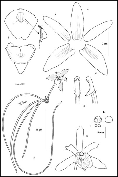 Descrição : planta epífita, cespitosa, com rizoma espesso com cerca de 5 mm de diâmetro, coberto de bainhas em escamas, raízes numerosas; pseudobulbos ligulados lanceolados, cerca de 8 × 1,5 cm, cobertos de 5-6 bainhas na base, a superior um pouco foliácea, cerca de 8 cm de comprimento, articulada, um pouco abaixo do ápice, segmento terminal oblíquo e sub-esférico, cerca de 1cm de comprimento; 2-3 folhas das quais uma se encontra no ápice do segmento basal do pseudobulbo e 1-2 na parte de cima do segmento apical, elíticas liguladas, 12-17 × 1,6-2,8 cm, um pouco conduplicadas na base, agudas no ápice, uninervuradas; inflorescência basal, no eixo da última bainha, do mesmo comprimento ou um pouco mais longa dos que as folhas, pedúnculo cerca de um terço do comprimento total da inflorescência, com 10-15 cm de comprimento, guarnecido de 4-5 brácteas estéreis triangulares agudas, com o comprimento de 1,8-2,3 cm, racimo pluriflora; pedicelo ovário com cerca de 2,8 cm de comprimento, cilíndrico, liso, bráctea floral triangular aguda, 2,5 × 0,7 cm ; flor resupinada, glabra, amarela clara salpicada de marrom claro ; sépalas lineares lanceoladas, cerca de 4,4 × 0,4-0,45 cm, agudas acuminadas, discretamente uninervuradas, as laterais um pouco recurvadas; pétalas estreitamente lanceoladas, com cerca de 3,7 × 0,5 cm, agudas acuminadas; labelo mais ou menos claramente panduriforme, com cerca de 3,2 × 0,9 cm ao nível da base e 1,4-1,7 cm no nível maior, agudo, com margem irregular e levemente ondulada, disco guarnecido na base por um carena curta, 6 mm de comprimento, grande, bífido no ápice, as 2 carenas divergentes e se prolongando por 2 nervuras que se afinam até o ápice do labelo; coluna curta e massiva, reta, com cerca de 7 × 3 mm, cavidade estigmática emoldurada por duas asas curtas, antera com cobertura apiculada na parte frontal, 2 políneas obovoides.