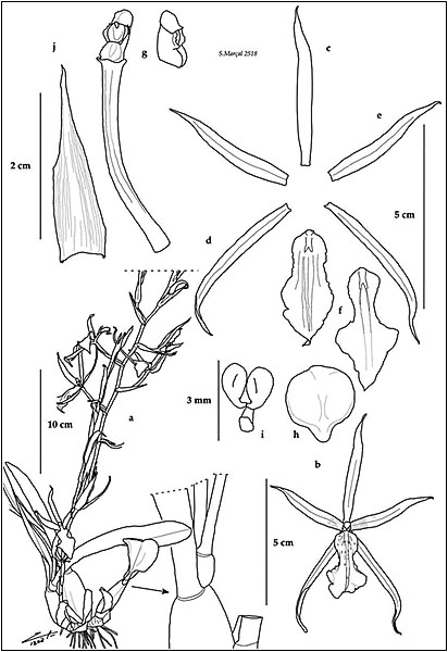 Haec species Scuticaria hadwenii (Lindley) Planchon similis est, sed foliis subduplo angustioribus, pedunculo multo breviore, floris valde minoribus, labello late rhombico indiviso pilis longis tecto, columnae pede breviore differt.