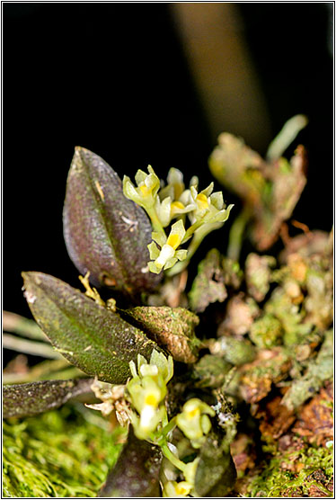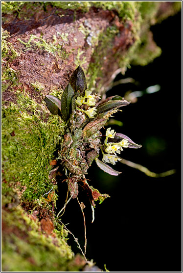 Pseudobulbo fusiforme, verde-escuro, ca. 6-8 x 3-4 mm.