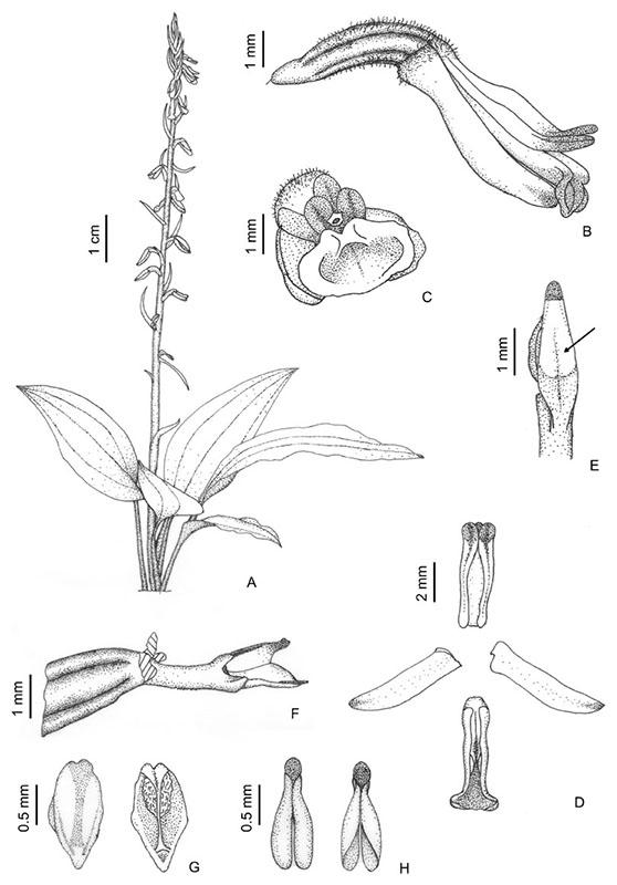 H. Visão dorsal e ventral do polinário (desenhos a partir do holótipo).