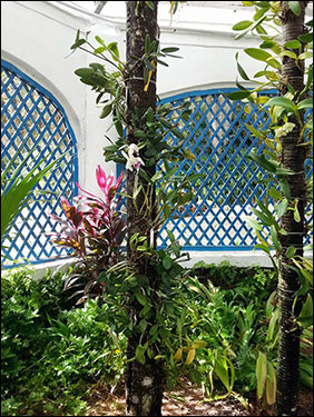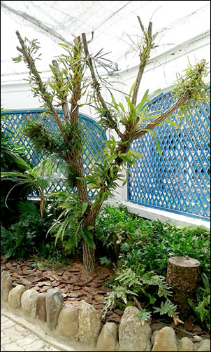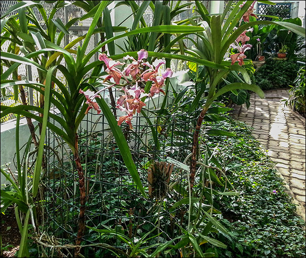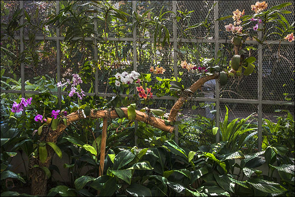 No espaço destinado à monopodiais, plantas do grupo das vandaceas caem do teto presas apenas por finos fios de metal, deixando suas raízes livres balançando ao sabor do vento. Estão também plantadas em um grande tronco e em volta de aramados sem nenhum substrato.