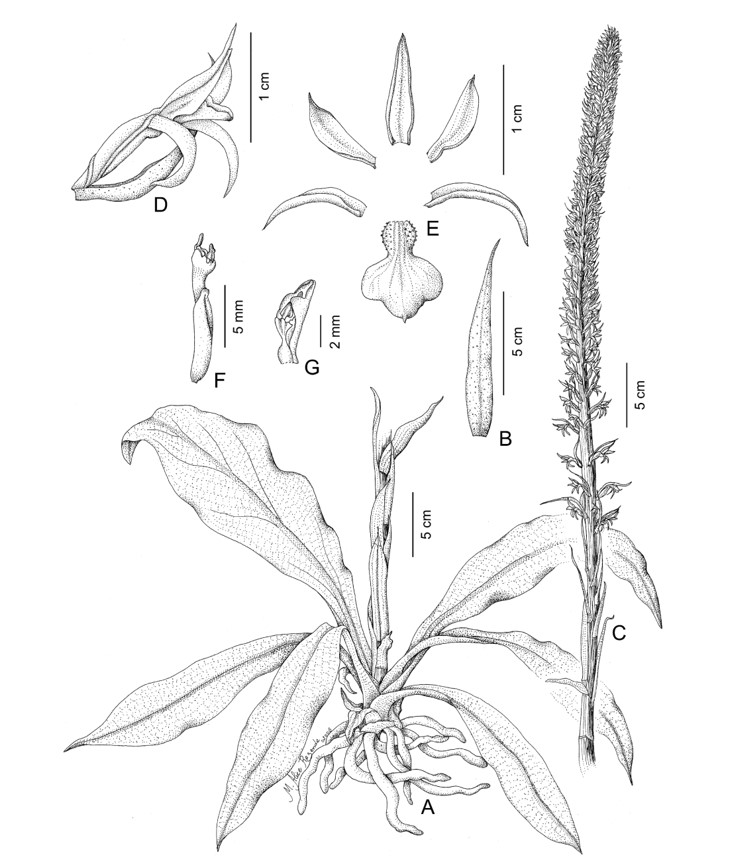 Erva terrestre. Raízes cilíndrico-fusiformes, pilosas, (0,3–) 0,5–1 cm diam. Haste inconspícua. Folhas em uma roseta compacta, presente durante a antese, pecíolo de 10,5-15 cm de comprimento, 1,2-1,8 cm de largura, lâmina elíptica, base atenuada, ápice obtuso, cartácea, glabra, verde, 24-29 cm de comprimento, 7,4-8,8 cm de largura. Inflorescência racemosa, glabra, 68 cm de comprimento, 1 cm de largura na base; pedúnculo de 36–39 cm de comprimento, coberto com 8 brácteas lanceoladas não comprimidas, ápice agudo, 7,5–9 cm de comprimento, 1,4–1,9 cm de largura; ráquis congestionado, 27-29 cm de comprimento, ca. 120 flores. Bráctea floral estreito-lanceolada, ápice agudo, glabro, 0,8–1,7 cm de comprimento, 0,3– 0,5 cm de largura. Flor ressupinada, verde. Pedicelo de até 0,1 cm de comprimento. Ovário fusiforme, curvo no ápice, glabro, 1–1,2 cm de comprimento, 0,2 cm de largura. Sépalas glabras, conduplicadas, dorsais livres, laterais logo adnadas na base, curvadas para trás; sépala dorsal lanceolada, ápice agudo, côncavo, livre, 0,9–1,1 cm de comprimento, 0,3–0,4 cm de largura; sépalas laterais lanceoladas, ápice agudo, 1–1,2 cm de comprimento, 0,2–0,25 cm de largura. Pétalas elípticas, oblíquas, vértices apiculadas, glabras, adnadas à sépala dorsal, 0,7–0,8 cm de comprimento, 0,3 cm de largura. Labelo levemente lobado, trilobado, séssil, curvado para trás, lábios laterais parcialmente adnados aos lados da coluna, parte basal elíptica, com glândulas nas margens, 0,3 cm de comprimento por 0,2 cm de largura; lobo lateral elíptico, ápice arredondado, levemente adunco, 0,3–0,35 cm de comprimento, 0,2–0,25 cm de largura; lobo médio semiorbicular, ápice obtuso, 0,2–0,25 cm de comprimento, 0,2–0,25 cm de largura. Coluna ligeiramente curva, canalizada na base 0,4–0,5 cm de comprimento, 0,2 cm de largura; antera lanceolada, côncava, móvel, séssil; clinandrium fechado; polinário constituído de 2 polínias bipartidas oboval, caudículo ausente, viscídio oval; estigma subterminal semiorbicular; rostelo espatulado, pli-capaz, emarginato remanescente de rostelo; pé da coluna completamente adnado ao ovário, oblíquo, 0,1 cm de comprimento. Cápsula elipsoide, marrom escuro e vernicose quando madura, 1–1,4 cm de comprimento, 0,5–0,8 cm de largura. Sementes não vistas. Veja as Figs. 1 e 2.