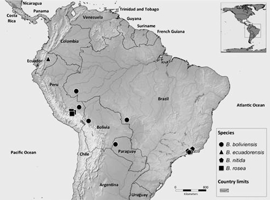 B. ecuadorensis (triângulos pretos), B. nitida (pentágonos pretos), e B. rosea (quadrados pretos) na