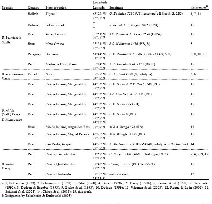 Segundo Rutkowski & Szlachetko (2008) Buchtienia incluia um espécie não descrita para o sudeste do Brasil, sem mencionar nenhum material específico. Nós presumimos que o taxon não descrito a que eles se referem corresponda a B. claudiae que foi subsequentemente descrito por Chiron & al. (2013) a partir de material coletado na divida dos estados do Rio de Janeiro e São Paulo. Um de nós (EMS) o coletou material estéril durante uma pesquisa em Mangaratiba, um município situado na região sudeste do estado do Rio de Janeiro, localizada no litoral central da Mata Atlântica (Saddi & al., 2005). O material foi mantido em cultivo no Jardim Botânico do Rio de Janeiro. A mesma espécie foi também coletada em duas outras localidades próximas no estado do Rio de Janeiro. (Table 1; Fig. 3).