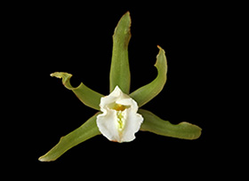 Labelo branco, e como nas demais espécies, trilobado, com os lobos laterais cobrindo a coluna.