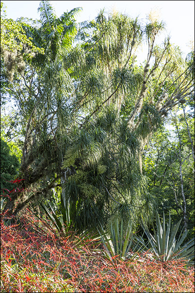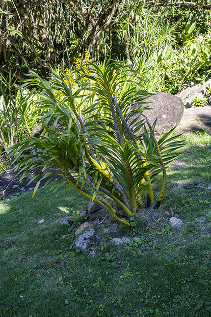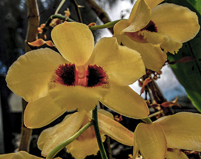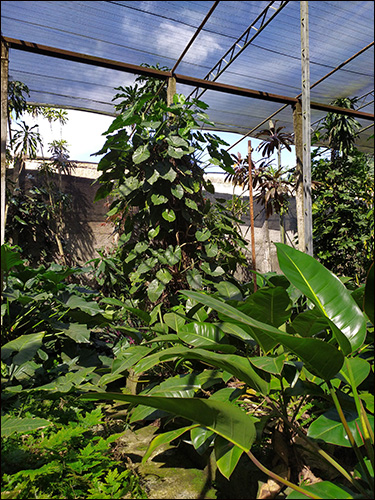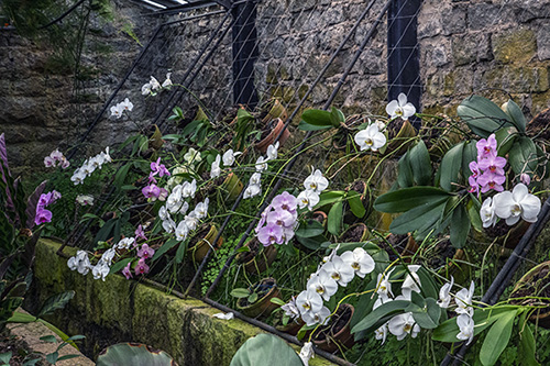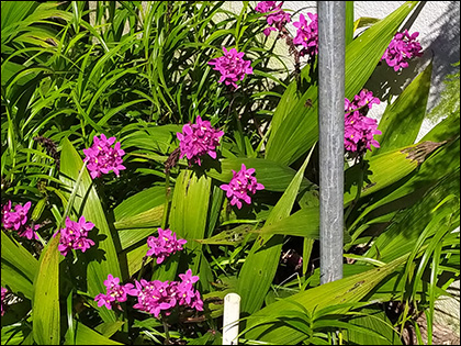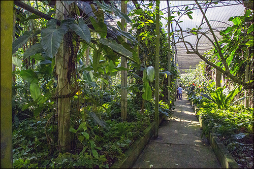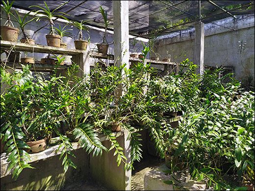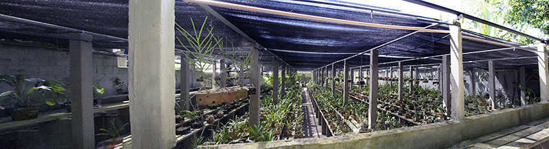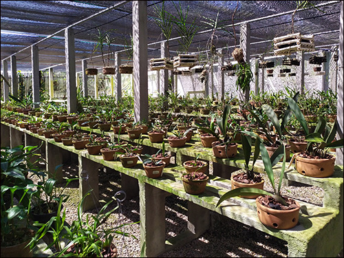 As espécies de Dendrobium e seus híbridos crescem vigorosamente na área ensolarada, ultrapassando 1m de altura, lançando suas longas hastes florais, assim como espécimes de Sobralia, Vanilla, Spathoglottis sp e Arundina graminofolia alba. |