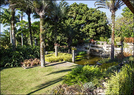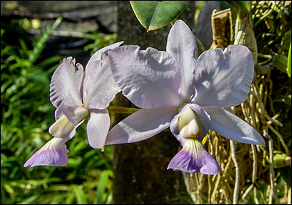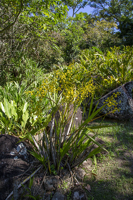 Na área externa e distribuída pelos belos jardins as espécies são cultivadas sobre as árvores ou rochas. Nestes jardins, espécies de origens tão diversas convivem harmoniosamente dividindo um mesmo espaço, numa mesma forma de vegetar. Um belo exemplar de Grammaotphyllum speciosum, vegeta sobre a rocha. Considerada como a maior orquídea do mundo, pode chegar a pesar toneladas e atingir o porte de uma árvore, é originária do sudeste asiático onde cresce como epífita ou como litófita. Cyrtopodium glutiniferum é uma espécie nativa que ocorre nos estados da Bahia Minas Gerais, Rio de Janeiro e Espírito Santo, em áreas de afloramentos rochosos e o gênero é limitado à América tropical. |