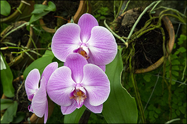 Para reproduzir a maneira como o Phalaenopsis viceja na natureza, foram criados telados que mantem os vasos inclinados, impedindo o acúmulo de água na parte central destas plantas.![]() |