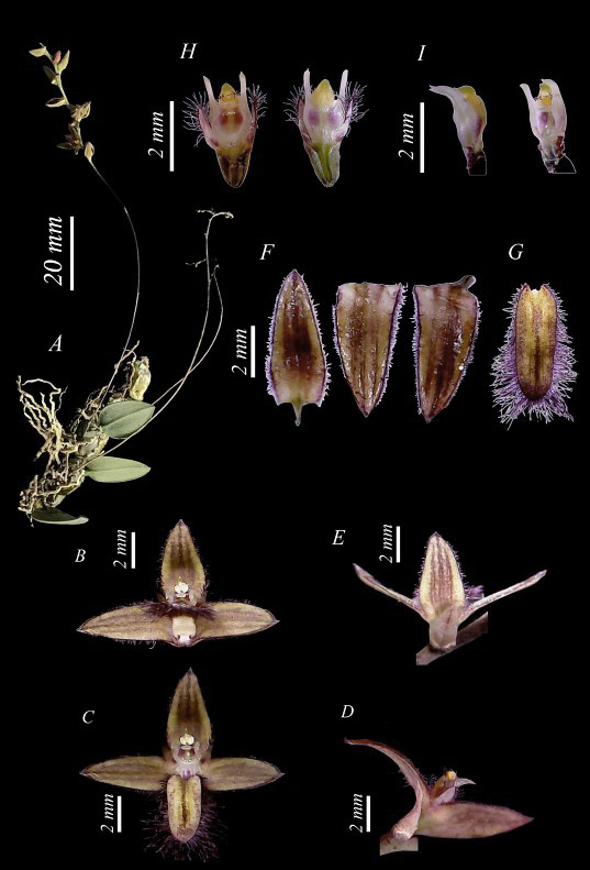 H, flor dissecada com sépalas e labelo removidos, mostrando colunas e pétalas nas vistas ventral (esquerda) e dorsal (direita)