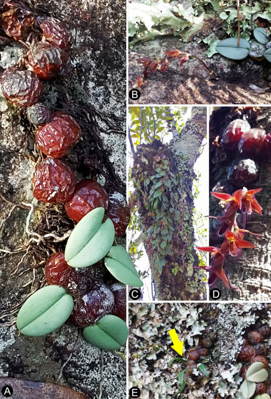 Crescimento rupícola (A, B, E) and epiphytic (C, D)