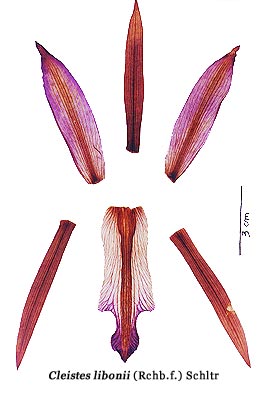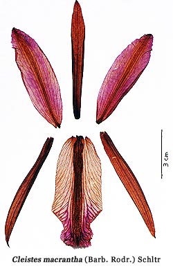 Geographical distribution To our country, Hoehne names 42 species and Pabst 47, however they are found from Florida until the south of Brazil. It seems to be a genus in evolution, as they are really variable since the appearance (the way of standing) of the plant and floral segments until the size and the shape of the leaves. Nowadays, there are at about 50 species but in the past, 80 were assigned to this genus. Many of them are considered nowadays just synonyms. Etymology The name comes from the Greek "kleistos" (closed) because the flowers, in general, do not open entirely. Description They are terrestrial herbaceous, from medium to high size, with slim stems ; erect or light sinuous, alternate rigid (almost coriaceous) leaves with amplexicaul base. The blooming season is in March and April and three months ago, the capsules are already developed. After the dehiscence of the capsules, the leaves started to fade away as well the entirely stem and some months after the Cleistes disappear of the embankments. Some time after, they rise again with a new shoot, emerging from the nodular tuberoid roots. G. Pabst in "As orquídeas do Estado da Guanabara" (Rio de Janeiro city) pointed out five species to Rio de Janeiro city, all of them finding in Tijuca Forest. In the way to the statue of Cristo Redentor we identified two species: C. libonii (Rchb. f.) Schltr. and C. macrantha (Barb. Rodr.) Schltr. |