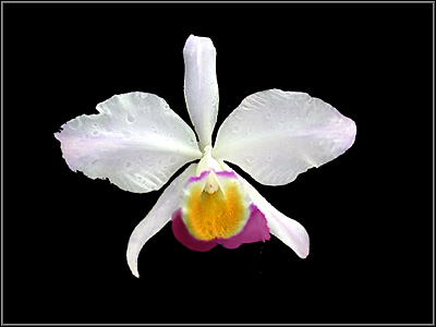 Sépalas e pétalas brancas; Labelo quase totalmente branco, com a fauce maculada de amarelo-alaranjado; lóbulo apical com mácula transversal rosa-vivo. | |