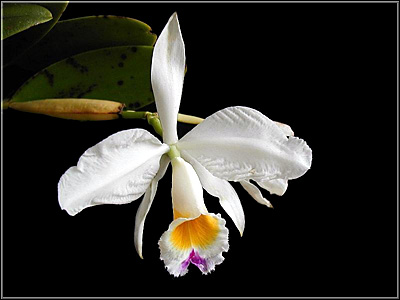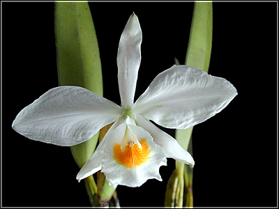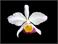 Plantas e flores de porte médio, com até 11 cm de diâmetro; Sépalas e pétalas brancas; Labelo quase totalmente branco, com a fauce maculada de amarelo-alaranjado. | |