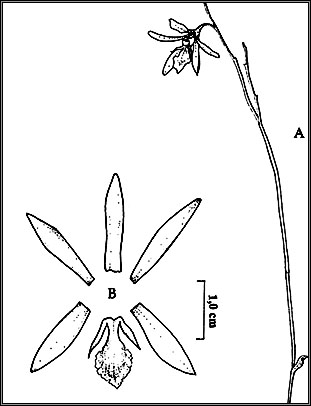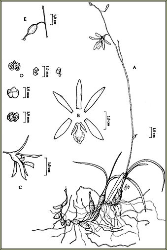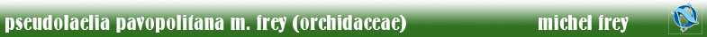 pavopolitana M. Frey Typus : Brazil, Espírito Santo, Vila Pavão, Morro do Cruzeiro, 18° 39’ S, 40° 33’ W, alt. 350 m approximately, collected in 2004 (with flowers) by M. Frey & L.C.F. Perim, M. Frey 672 (holotypus : MBML, #24007) ; isotypus (LY) collected in May 2005 (with flowers) by M. Frey & L.C.F. Perim, M. Frey 851. DescriptionRhizome 2,5 a 3 mm diameter, 2 cm distance between the pseudobulbs, recovered with scarious imbricate, violaceous sheaths , from 5 to 6 enter-nodes, little branched ; numerous and whitish roots arising from every point of the rhizome, simples, reaching 15 cm long; ovoid erect pseudobulbs, 2 cm tall and 1 cm wide, slightly lateral flattened, 4-5 enter-nodes, recovered by scarious sheaths in the first year and then bared, violaceous and plurisulcate, lasting for 5-6 years; from 2 to 3 leaves, reaching 8 cm long and 5 mm wide, distichious, arising from the apex of the pseudobulb, linear, with the base surrounding the inflorescence, acute extremity, longitudinally folded over the central veins, quite curved, dark green glabra, smooth margins, translucent central nervure ; inflorescence reaching 25 cm long, in general simples, rarely branched, arising between the leaves in the apex of the pseudobulb, until 8 (10) flowers open successively; erect cylindrical peduncle reaching 15 cm, 0,6-0,8 mm diameter, quite dark purple, recovered with 6-8 scarious sheaths, first imbricate, then more spaced, decreasing length from 20 mm to 6 mm; rachis reaching 10 cm long, a little arched, cylindrical, 0,4-0,5 mm diameter, dark purple; spread bracts, triangle-acute, 3 mm long, light brown; pedicel spread reaching 15 mm with the the ovary, 0,3 mm diameter, light ochre, ovary de 5 mm × 0,5 mm, green; flower 16 mm long, 20 mm wide and 8-10 mm depth, wide open, horizontal or slightly nutans;10 mm long sepals, 3 mm wide, lineo-oval, acute apex , light green slight yellow, dorsal sepal a little concave, the lateral are spread, glabra, smooth margins, 3 veins clearly visible; petals 10 × 1 mm long, linear-oblongs, apex obtuse, spread, light green slightly yellow, glabra, smooth margins; lip com 8-9 × 4 mm, 3-lobed, fused to the column until its half, forming at the back, with the lateral sepals, a green hemispheric nectary, at about 1,5mm diameter, fused to the ovary, the lateral lobes slightly involving the column, 2,5-3 mm long, 0,4 mm wide, linear with acute twisted back apex, then forming an istme at about 1mm long, divided into 2 parallel semi-cylindrical calli, slightly pink, developing in a trapezoid lobe elongate with rounded apex, the center formed by 5-7 calli slightly divergent, hirsute, white a little yellowish and the periphery, pink, strong undulate, at about 1 mm wide; column de 2,5 × 1 mm, straight, green, expanding into two terminal wings with whitish margin which involves the anther, terminal, ventral stigma; 8 pollinia, yellow golden, subequal; Pod 15 mm long, ellipsoid, finishing by a kind of cylindrical ‘’proboscis’’ which carries the remains of the flower, green, the lines of the dehiscence are visible in relief. See drawing 1 and photographs. Fig. 1, 1a e 1b: Pseudolaelia pavopolitana M. Frey and details