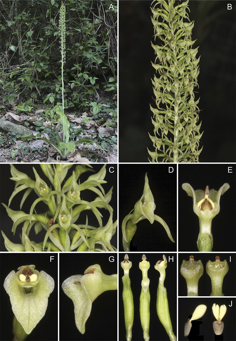 FIG.2 . Hábito e morfologia de Buchtienia nitida. A, hábito; B, inflorescência; C, detalhe da inflorescência com flores abertas; D, flor em vista frontal; E, lábio e coluna em vista dorsal; F, lábio e coluna em vista frontal; G, lábio e coluna em vista lateral; H, ovário, coluna e polinários em vista dorsal, ventral e lateral, respectivamente da esquerda para a direita; I, coluna em vista dorsal e ventral com polinários removidos, respectivamente da esquerda para a direita; J, polinários em vista lateral e ventral, respectivamente da esquerda para a direita. |