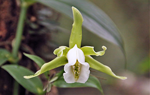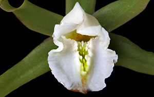 Labelo branco, e como nas demais espécies, trilobado, com os lobos laterais cobrindo a coluna.