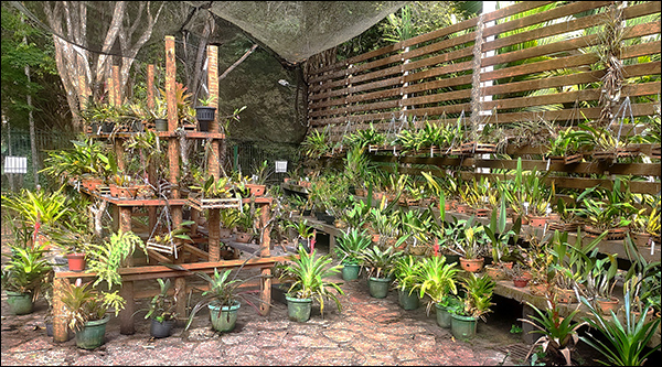 Soon after the beginning of the collection, as an experience, the flowering plants were taken to specific places in the beds where the bromeliads are so that the public had closer access to the exuberance and perfume of their flowers, but flowers and seedlings were removed from their vases, making this exposure impossible. Thus, currently, the plants can only be seen through the protective grid of the screen, next to which a bench was prepared where those that are flowering in the period are arranged, being carried out a continuous relay.
